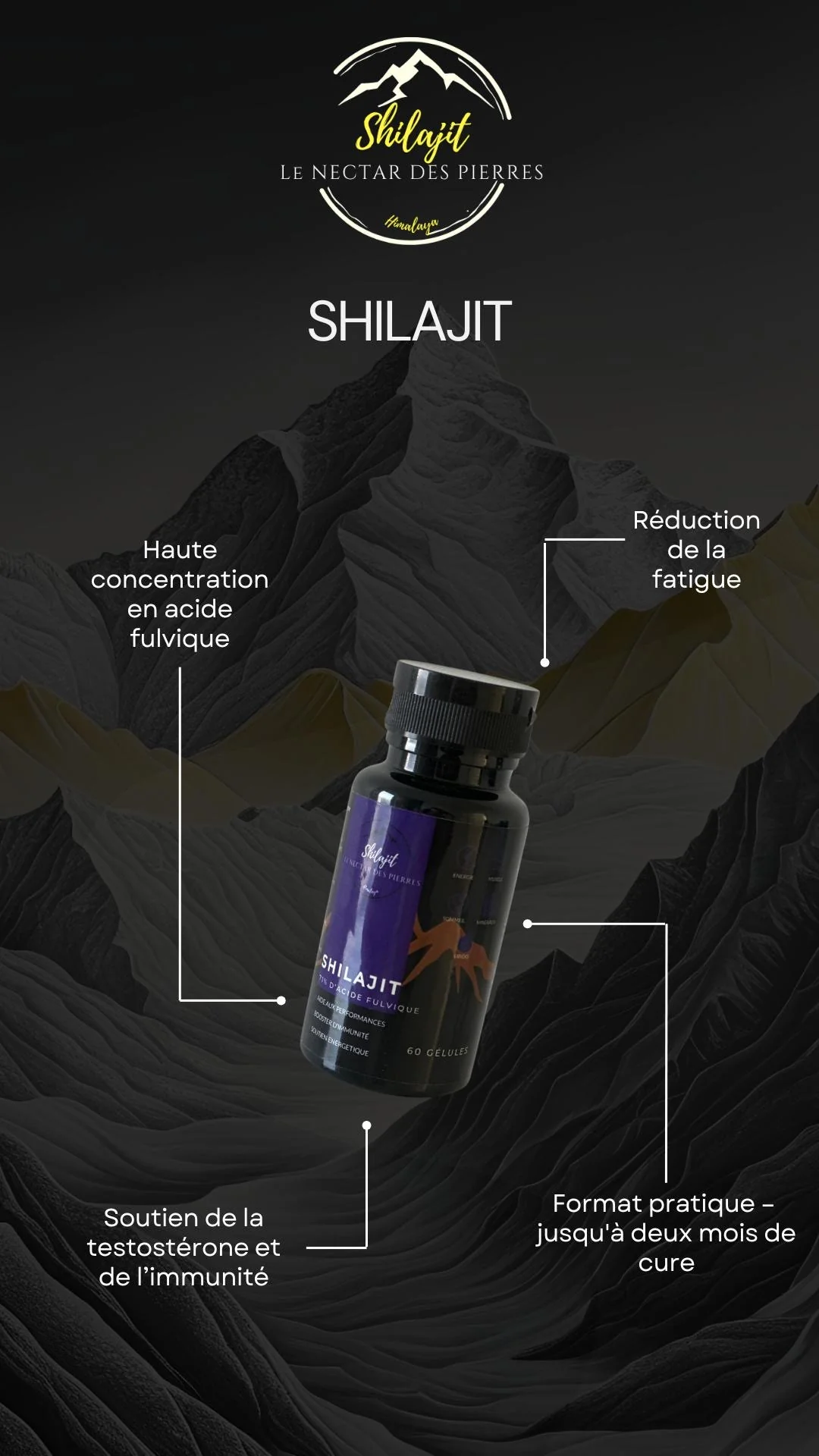 Retrouvez toute la puissance du Shilajit pur dans une boîte de 60 gélules dosées à 500mg, avec plus de 70% d’acide fulvique. Un allié 100% naturel pour booster énergie, endurance, concentration et équilibre hormonal.
