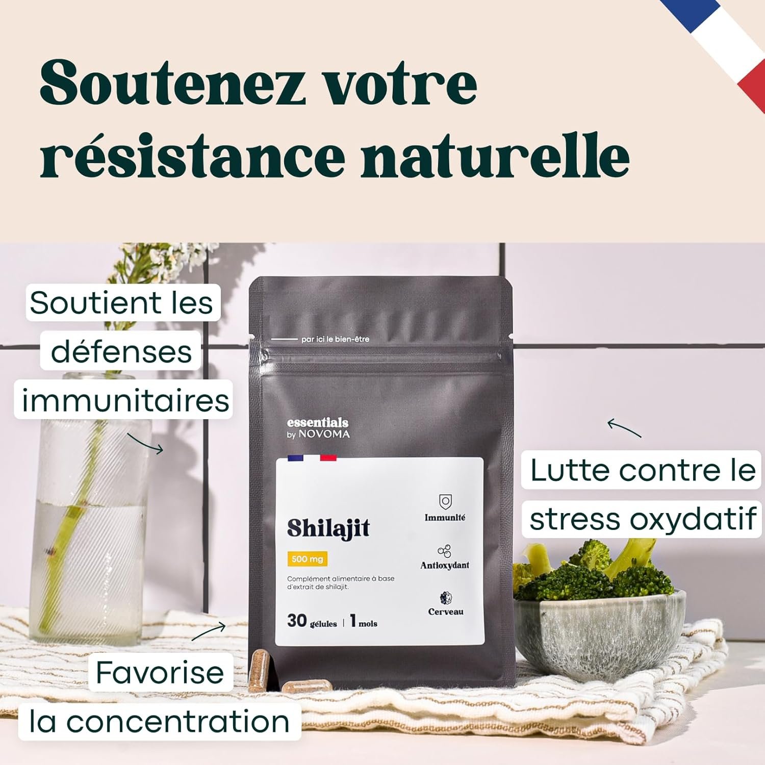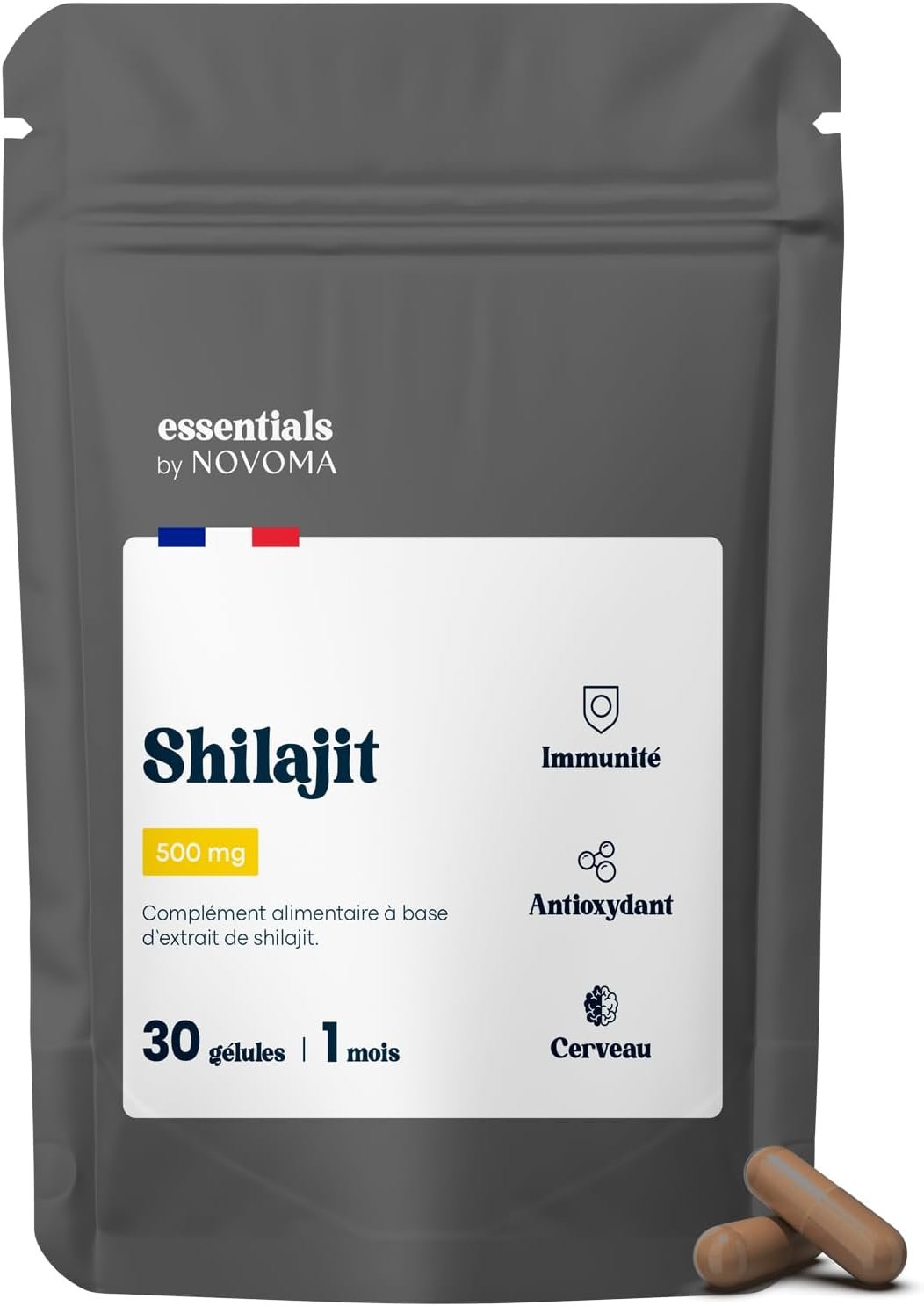 Shilajit Pure 500mg, 50% Acides Fulviques, Complément Naturel pour l’Immunité & Cognition, 30 Gélules, Cure de 1 mois, Fabriqué en France, Essentials by Novoma